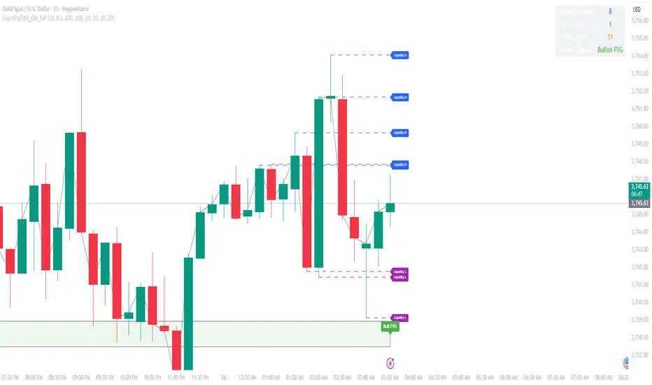 Fair-Value Gaps (FVG) – inefficient price gaps between candles.
