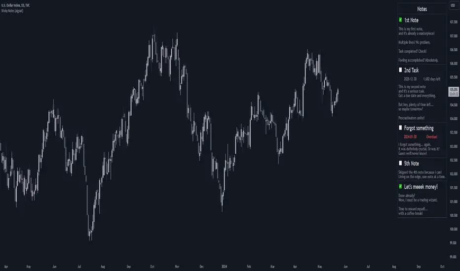 Ever feel like your trading notes are all over the place, much like your portfolio after a market dip? Worry not! With this script, you'll have all your trading notes, tasks, and brilliant (or not so brilliant) ideas neatly organized right on your chart. It's like having a sticky note board, but way cooler and without the risk of paper cuts.
