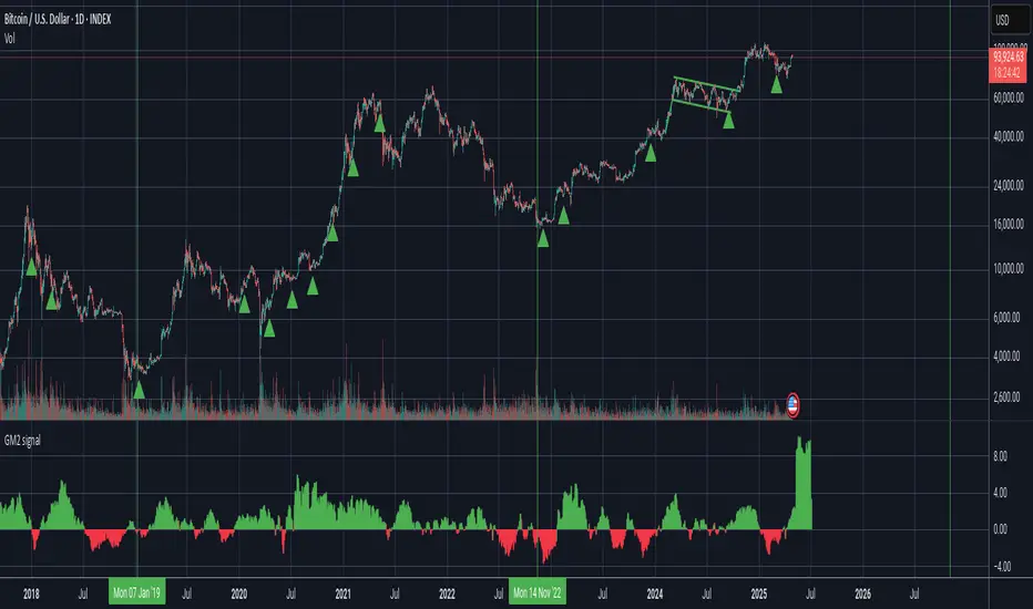 The script produces a signal each time the global M2 increases more than 2.5%. This usually coincides with bitcoin prices pumps, except when it is late in the business cycle or the bitcoin price / halving cycle.