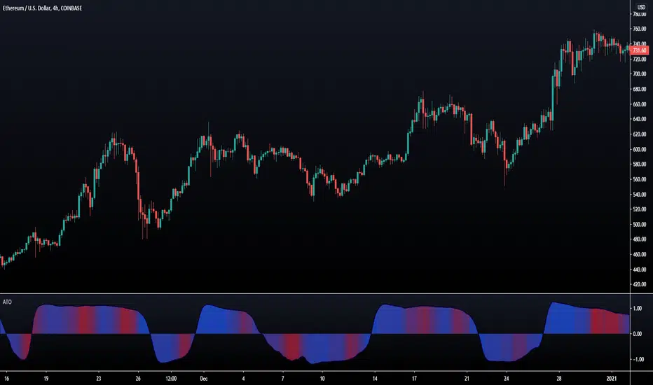 The following indicator is a normalized oscillator making use of the arc tangent sigmoid function (ArcTan), this allows to "squarify" the output result, thus visually filtering out certain variations originally in the oscillator. The magnitude of this effect can be controlled by the user. The indicator contains a gradient that shows the possibility of a reversal, with red colors indicating that a reversal might occur.