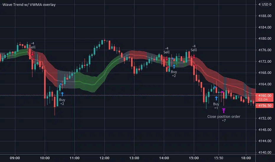 The strategy identifies potential signals based on the on the Wave Trend oscillator, originally ported to TradingView by LazyBear. When a signal is produced by the Wave Trend oscillator, trade size is determined by the VWMA.