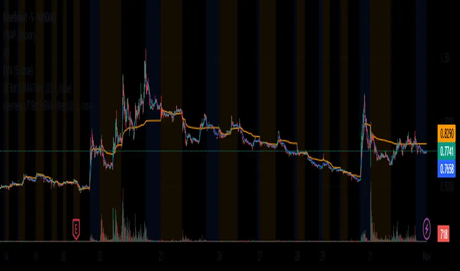 this script is a custom ut bot signal generator using a 9 ema filter and atr based thresholds. it shows buy/sell signals based on crossover logic and works well for volitality based set ups. created by inyerneck