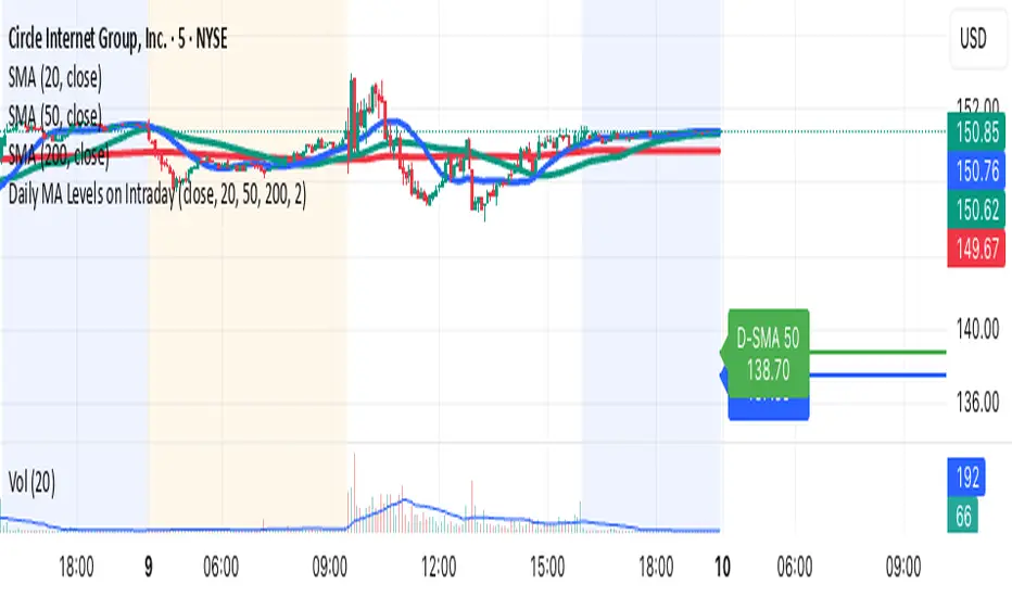 This script draws the daily simple moving average levels on the intraday chart. By default it shows 20, 50 and 200 SMA. You can choose the MA you want.