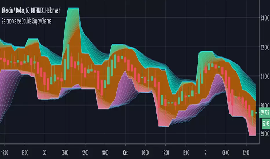 The Zerononcense Double Guppy is a significant upgrade over both of the aforementioned indicators because it incorporates substantially more information for the user to make use of while trading.