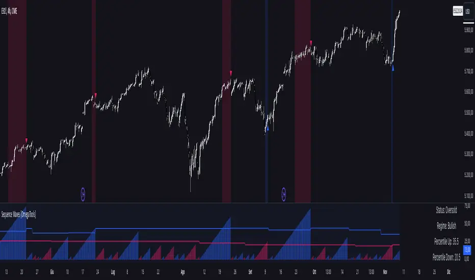the sequence waves indicator, developed by omegatools, is a multi-functional tool designed to detect trends, sequences, and potential reversal signals based on price movements and volume. this indicator has two main modes, "trend" and "sequence," which determine how the indicator calculates directional changes. additional enhancements in this version include reversal signals, allowing users to identify potential long and short opportunities with specific entry cues.