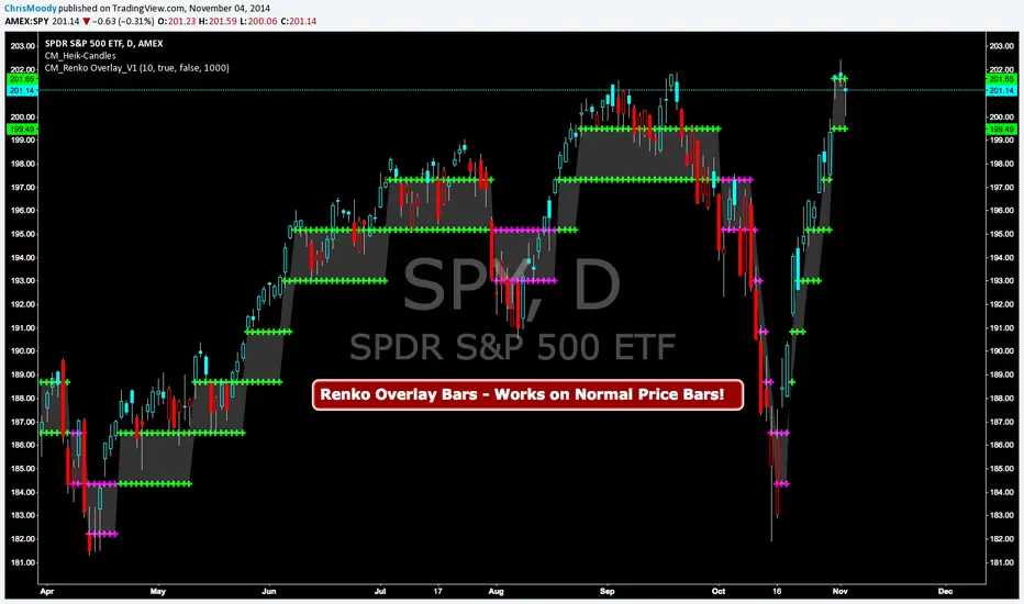 Default Renko plot is based on Average True Range. Look Back period adjustable in Inputs Tab.