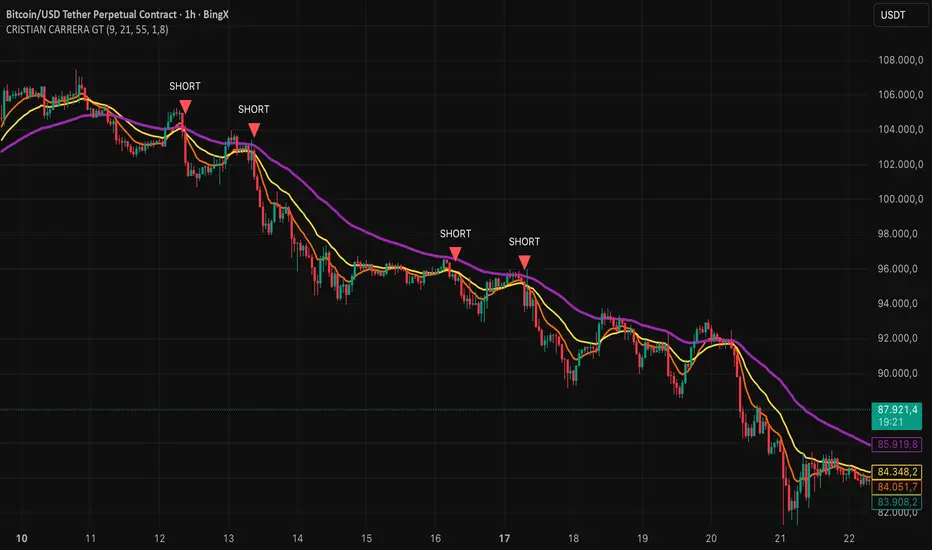 This indicator was developed from the analysis of EMAs. We use EMAs of different periods to validate price action.