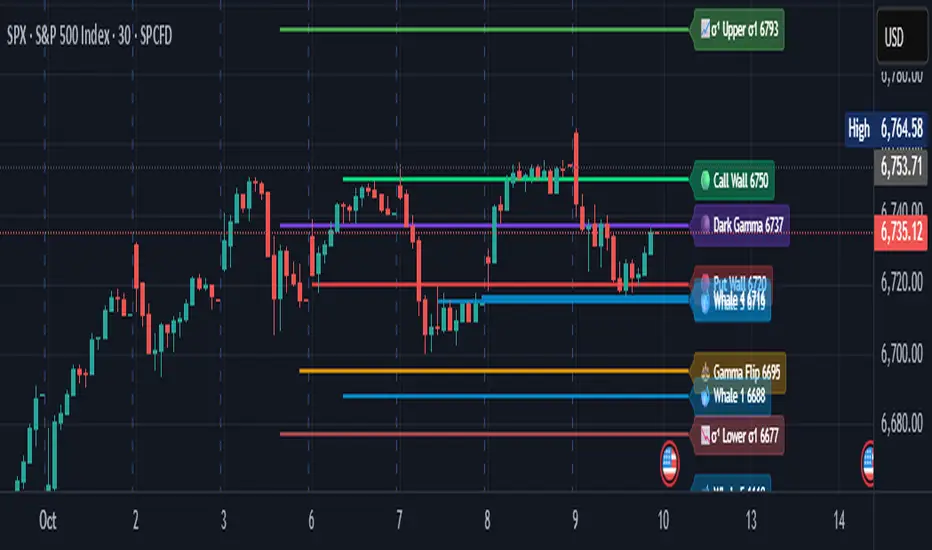 Options Levels 🎯 plots 13 key institutional and options-based levels directly on your chart — including Call Wall, Put Wall, Gamma Flip, Whales Pivot, five Whale levels, and Sigma deviation bands (σ¹ / σ²).