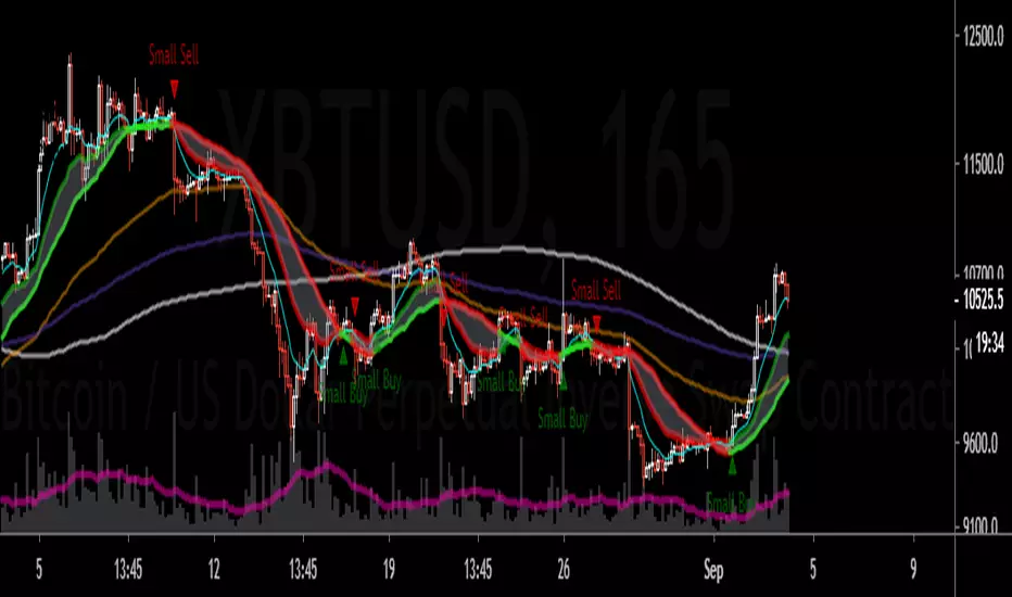Small entry is given when the cyan line crosses the Faster moving ema while the validation happens when the color of the bands flip to green and red