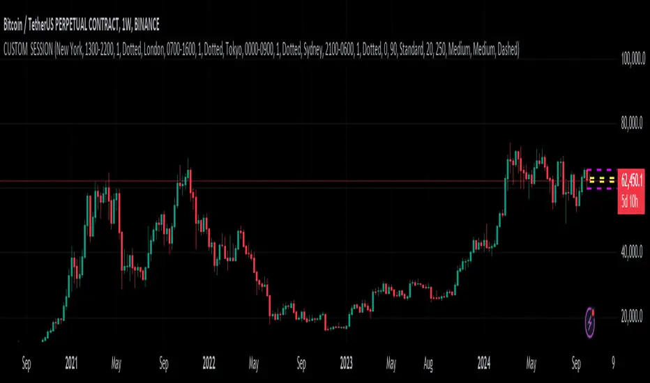 This Pine Script code creates a custom indicator that allows users to visualize different trading sessions (New York, London, Tokyo, Sydney) on a chart and customize various features such as line style, color, label text, and more. Here are the key user-end features: