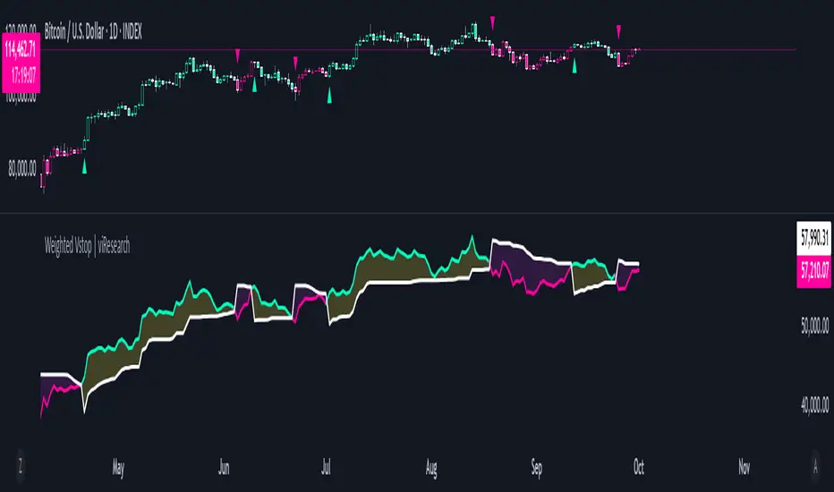 The "Weighted Vstop | viResearch" indicator provides an adaptable and powerful solution for traders who want to use volatility-based stop-losses to identify trend shifts. By integrating a weighted closing price with an ATR-based Vstop, this script helps traders remain aligned with trends while managing risk efficiently. Incorporating this tool into your trading strategy can improve your ability to capture trends and minimize losses during market reversals, offering a reliable and customizable option for traders at all levels.
