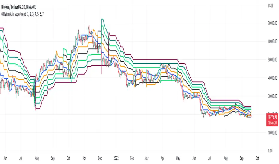This is a multiple multi-timeframe version of famous supertrernd only with Heikin Ashi as source. Atr which stands in the heart of supertrend is calculated based on heikin-ashi bars which omits a great deal of noises.