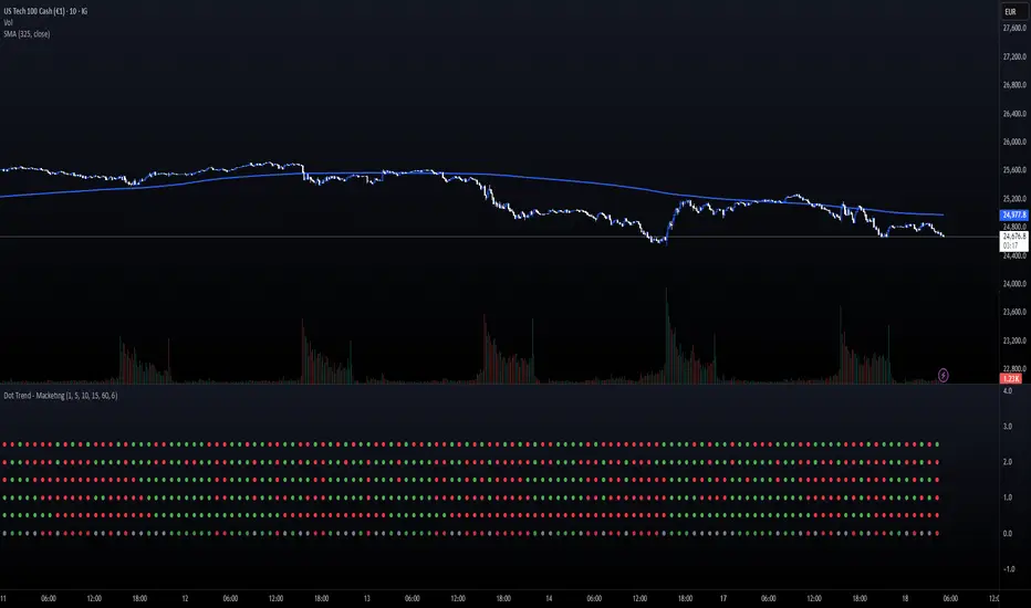 The DOT TRENDS indicator is a powerful, highly customizable tool designed to provide a clear, aggregated view of trend direction across five distinct timeframes (TFs). It uses an advanced ATR-based trailing mechanism coupled with an optional MACD filter to generate reliable trend signals, making multi-timeframe analysis simple and non-cluttered.