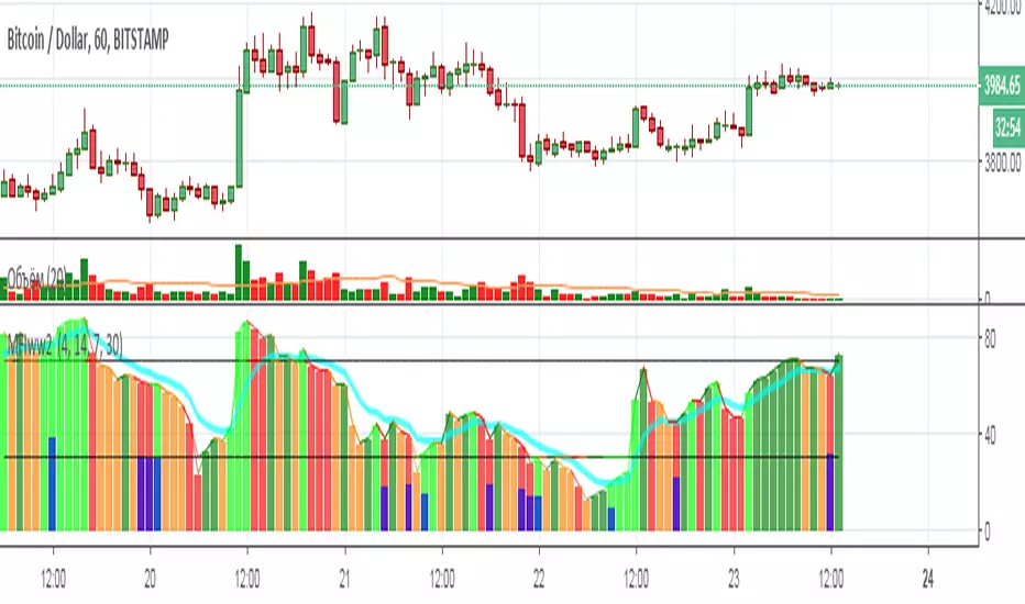 Vertical columns are painted in different colors depending on the displacement of the indicator and the displacement of the volume. The indicator can increase or decrease (+-). The volume can also increase or decrease (+-). The combination of these factors generates four types of indicator columns.