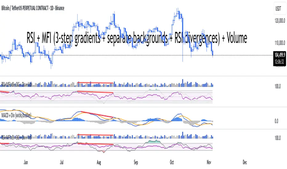 RSI + MFI (3-step gradients + separate backgrounds + RSI divergences) + VolumeNotas de prensa
