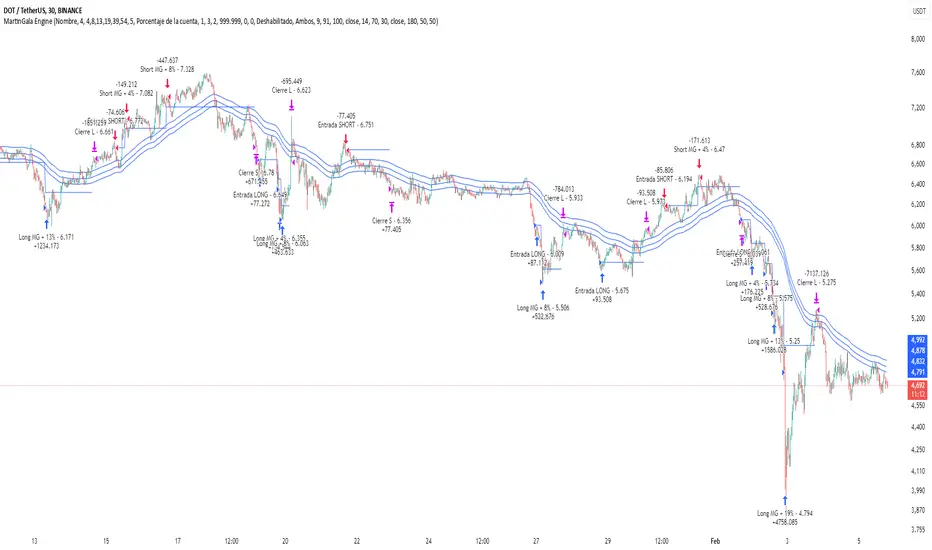 Utilizando un método de gestión de riesgos inspirado en la técnica MartinGala, incrementa progresivamente el tamaño de las posiciones en respuesta a pérdidas, lo que ayuda a recuperar rápidamente. Incluye configuraciones de comercio continuo y un objetivo de beneficio para cerrar operaciones con éxito. La estrategia permite visualizar las señales y el desempeño a través de gráficos y tablas de operaciones, proporcionando así una clara visión del mercado y facilitando la toma de decisiones informadas.