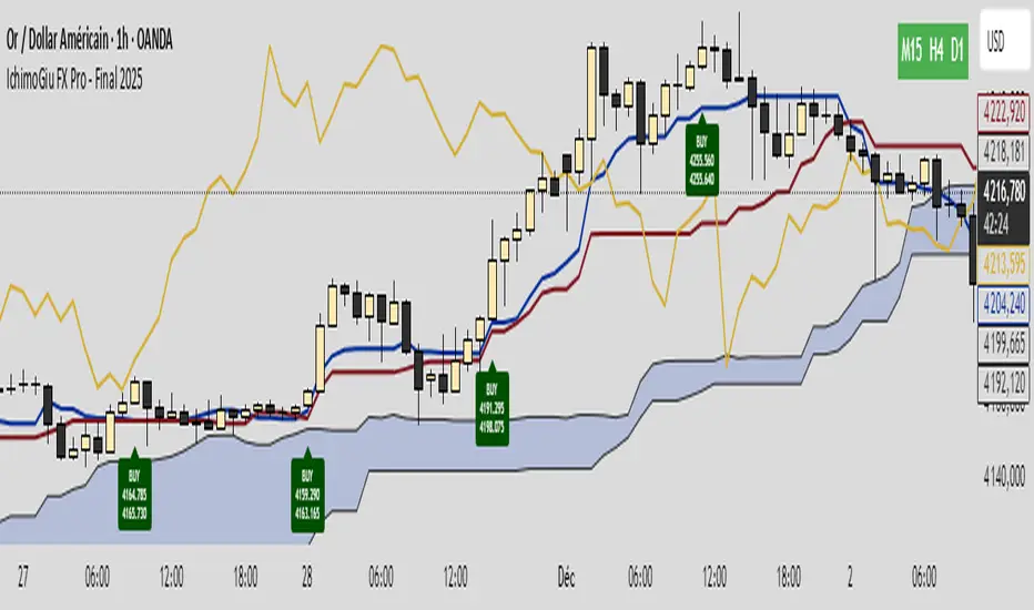 IchimoGiu FX Pro is an invite-only indicator designed to identify high-probability trend continuation setups using a dual-stage logic that combines market structure breaks with a custom Ichimoku-based confirmation engine.