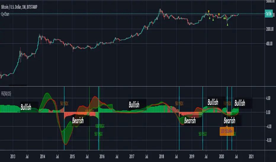 - The thickest line is the FG oscillator: Red/Green coloring indicates if the market is in a Bearish/Bullish period.