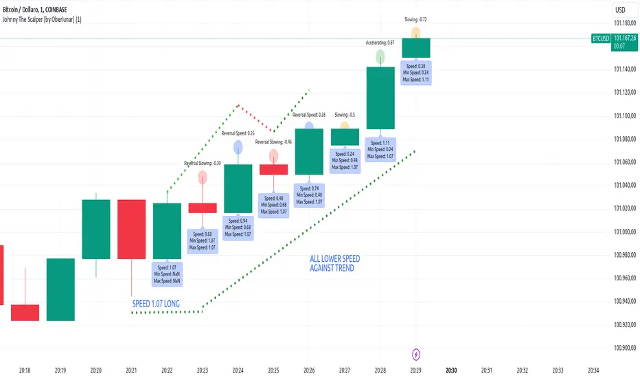 The Johnny The Scalper [by Oberlunar] indicator is designed to provide scalpers with insights into market momentum and speed dynamics by analyzing the price movement within candles. It calculates the "candle speed," defined as the range of a candle (high minus low) divided by the elapsed time in seconds since the candle opened. Users can customize the distance for comparison by specifying how many candles back the indicator should look when calculating the speed difference (`Diff`).