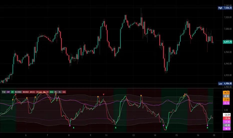 The HUD shows: TF, signal mode, session status, regime, bias, ADX, Zenith, velocity, exhaustion flag, OB/OS state, and a blended master score.