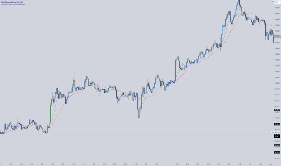 Bullish crossover: The blue MA crosses above the red MA + displacement candle → Potential long signal.
