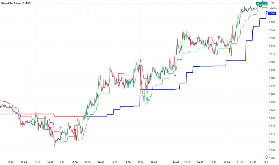 1️⃣ ATR Trailing Stop – calculates two adaptive ATR lines (fast and slow) that define volatility context, trend bias, and potential reversal points.