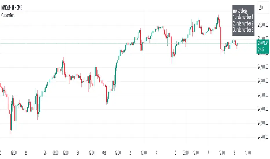 This indicator allows you to display custom text anywhere on your TradingView chart with full control over appearance and positioning.