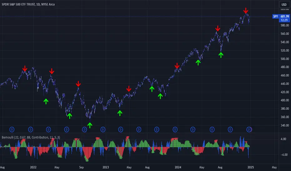 This indicator is the Bernoulli Process or Wikipedia - Binary Entropy Function. Within Information Theory, Entropy is the measure of available information, here we use a binary variable 0 or 1 (P) and (1-P) (Bernoulli Function/Distribution), and combined with the Shannon Entropy measurement. As you can see below, it produces some wonderful charts and signals, using price, volume, or both summed together. The chart below shows you a couple of options and some critical details on the indicator. The best part about this is the simplicity, all of this information in a couple of lines of code.