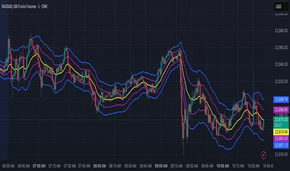 The central yellow line is a Double Exponential Moving Average, which offers a smoother, less laggy trend signal than traditional moving averages. It represents the market’s short- to medium-term “equilibrium.”