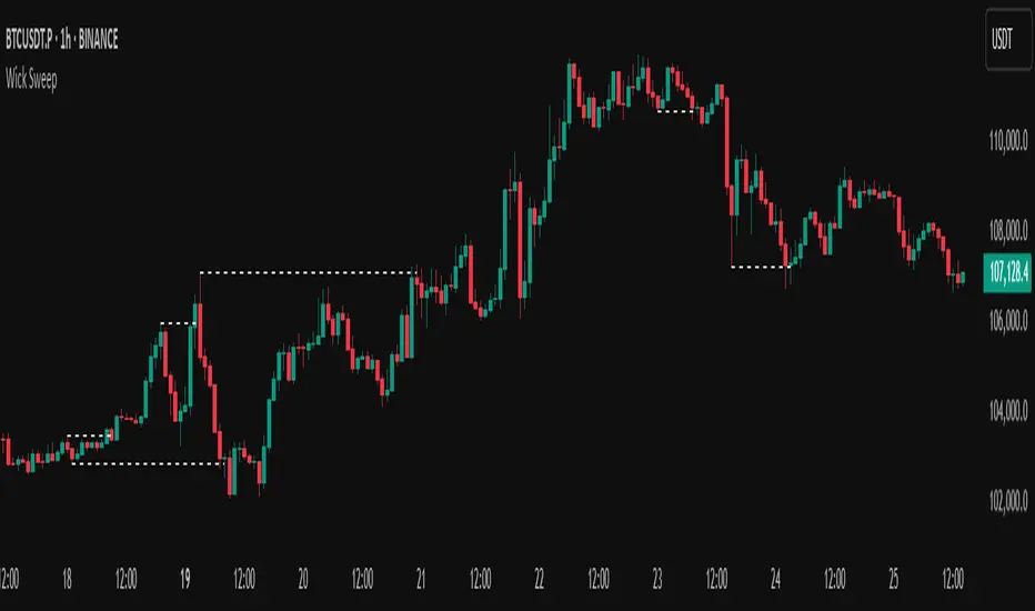 * Line Plotting: When a wick sweep is detected, a dashed line is drawn at the price level of the failed low or high, visually marking the potential reversal zone.