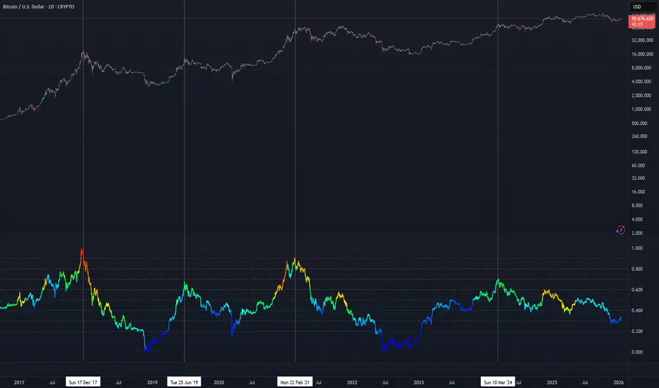 This indicator combines two complementary risk engines into a single framework. Engine A (the BTC Risk Metric) produces a normalized 0–1 risk line by measuring Bitcoin’s logarithmic distance from a long-term trend (a 377-day simple moving average), scaled by time to account for Bitcoin’s exponential growth. This core line is excellent at identifying low-risk accumulation zones near major cycle bottoms and provides a consistent, regime-aware baseline that allows different market cycles to be compared on the same scale.