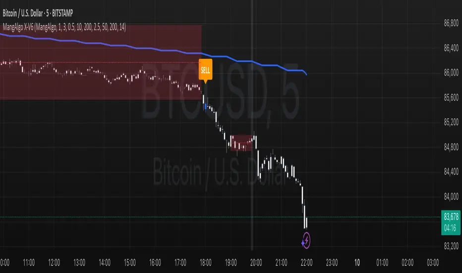 The MangAlgo X-V6 script is a multi-component indicator designed to generate buy and sell signals on TradingView charts by combining several technical analysis techniques. It is tailored for various trading styles – including Scalping, Day Trading, and the custom MangAlgo approach – by automatically adjusting parameters based on the selected preset. The primary goal of the script is to deliver more accurate signals by integrating additional filters and a robust trade management system.