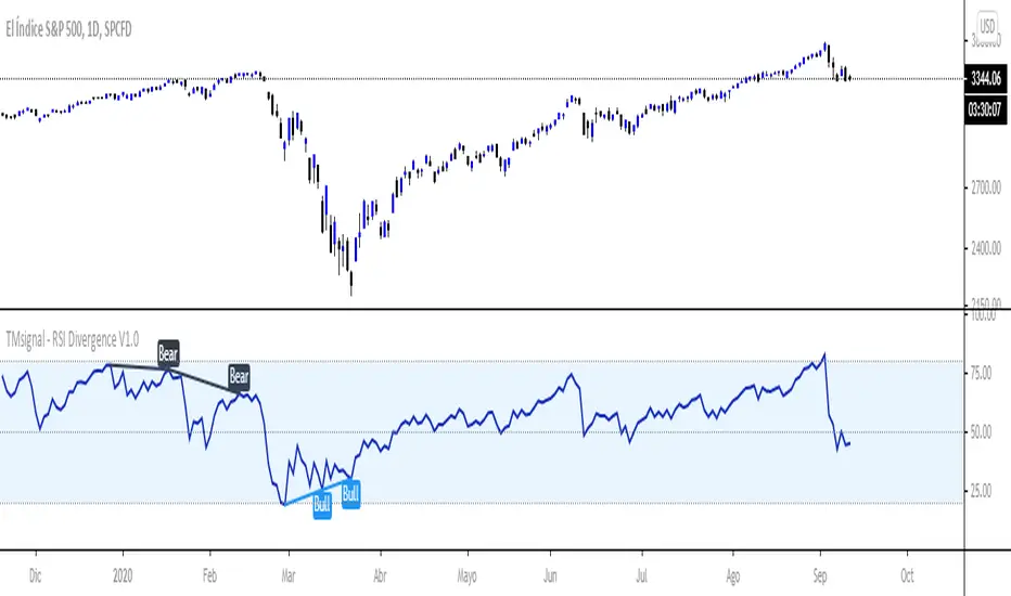TMsignal - RSI Divergence V1.0: It automatically shows RSI Divergence, being much useful for detecting future changes in the tendency of the current stock, and weakness in the actual tendency.