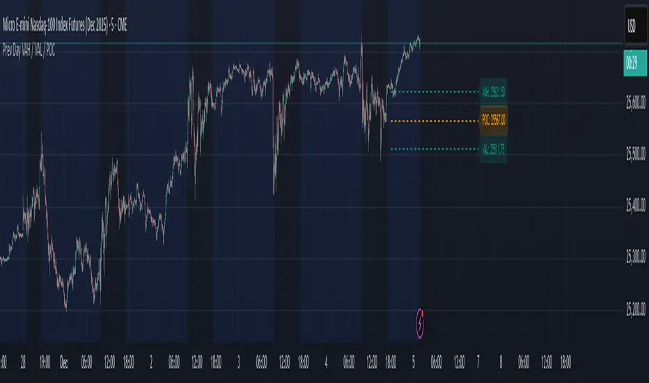 “Prev Day VAH / VAL / POC” gives you previous-session value levels (POC, VAH, VAL) as clean horizontal lines + labels — no bulky histograms, no unnecessary clutter.