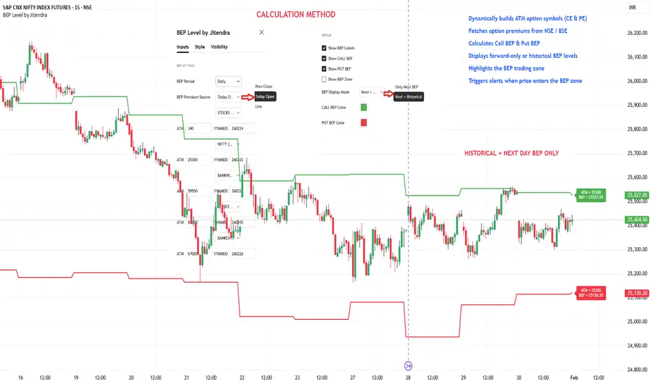 Options Break-Even (BEP) indicator that calculates and plots Call & Put BEP levels using real option premiums.