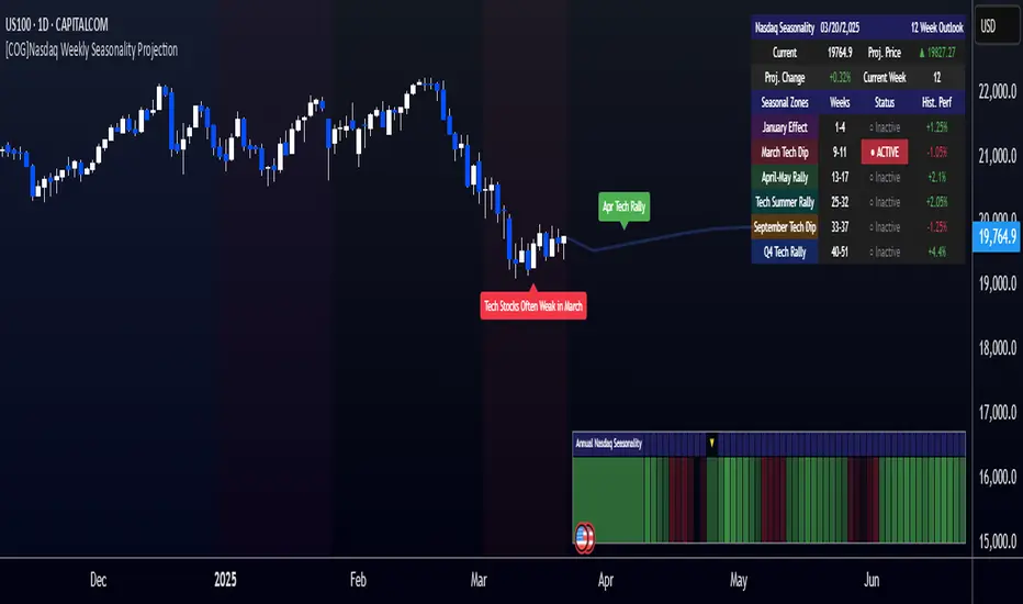 This indicator provides a visualization of Nasdaq seasonality patterns based on historical weekly performance data. It projects price movements for up to 26 weeks ahead, highlighting key seasonal periods that have historically affected tech stocks.