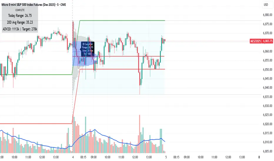 The script adapts the Initial Balance window using volume, rather than a fixed time, to better reflect true market participation.