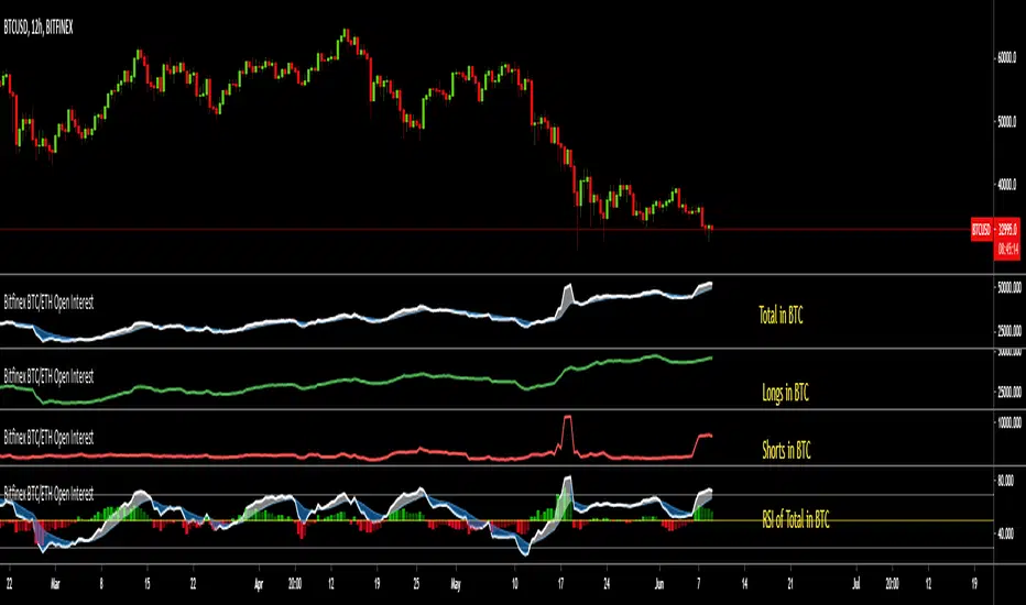 This indicator allows to analyze this Bitfinex Open Interest data for BTC and ETH. By default it shows the Total Open Interest (Longs + Shorts) in BTC. A 10 period EMA is applied to the data.