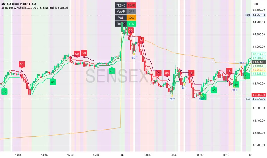 This indicator is an intraday scalping system primarily for Nifty and Sensex that trades only when strong trend conditions are present. It uses Fast and Slow SuperTrend to identify direction and entry timing, with an option to trade using either Dual SuperTrend (safer) or Single SuperTrend (aggressive) mode.