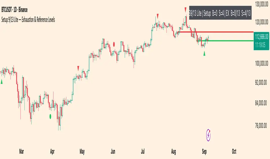 A clean, lightweight tool that implements the classic 1–9 setup progression, to-13 exhaustion signal, and bar-#1 reference levels. Built for clarity with minimal chart clutter.