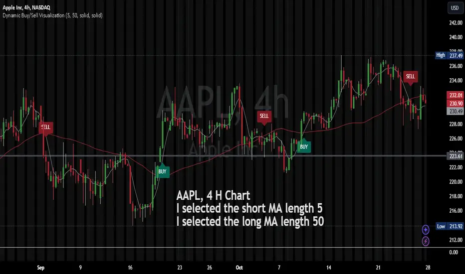 Visual Signals: Dynamic lines appear at the points of SMA crossover, with labels to indicate 'BUY' or 'SELL' opportunities.