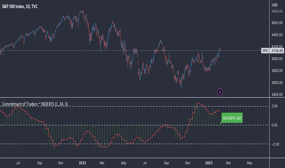 My intention was to create 1 script for the Commitment of Traders report but I wasn't not aware there is a limit on how many instrument calls can be made in PineScript so I had no choice but to divide the script into instrument categories. So far I have created 4 of them: Forex, Metals/ Commodities, Treasuries & Indexes which is the one presented here. If you are interested in the other ones, feel free to do a search.