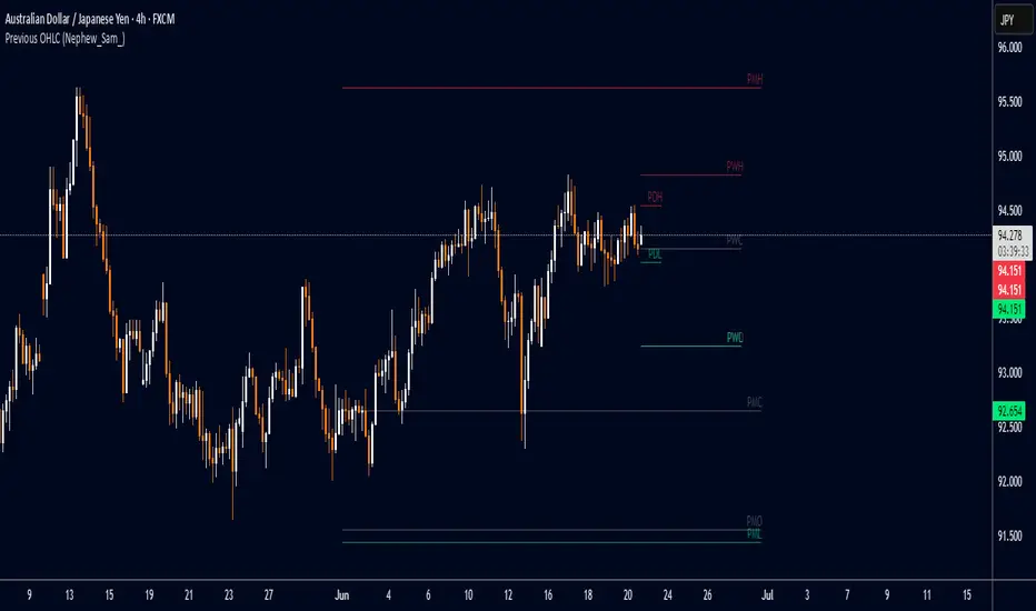 This indicator plots the OHLC of a previous HTF candle with an option to show the HTF candle too on the lower timeframe.