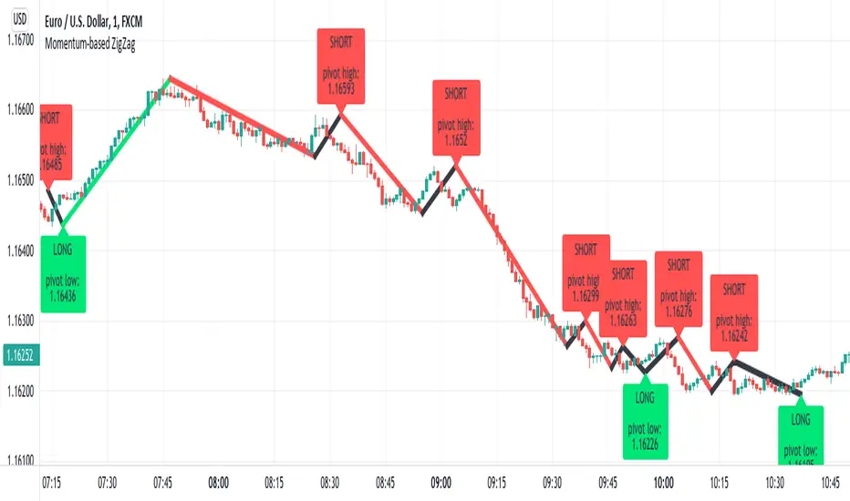 So whichever momentum indicator you choose - yes, there is a pick-your-poison-type selector as in in-famous Moving Average indicators - once it reverses, a highest (or lowest) point from the impulse is caught and ZigZag gets printed.