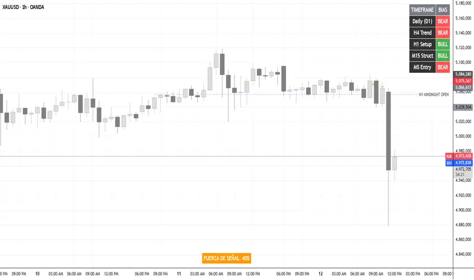 The indicator analyzes in real-time the Bias of 5 key timeframes: Daily (D1), 4 Hours (H4), 1 Hour (H1), 15 Minutes (15M), and 5 Minutes (5M). It uses a price-action logic comparing opening and closing prices to determine who controls the order flow at every level of the market.