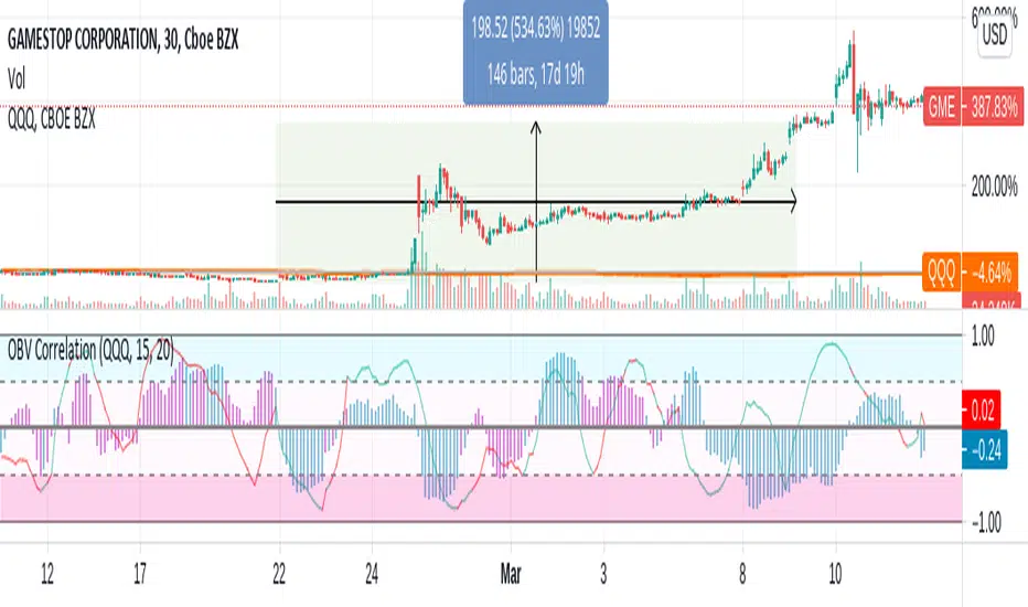 - I have included the direction of OBV for your currently plotted equity encoded as color. (Thus you know that if the plot is negative and blue, that the correlation is negative but the OBV for your current equity is increasing.)