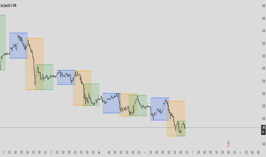 • Transparent design — semi-transparent fills keep candles readable even when sessions overlap.
