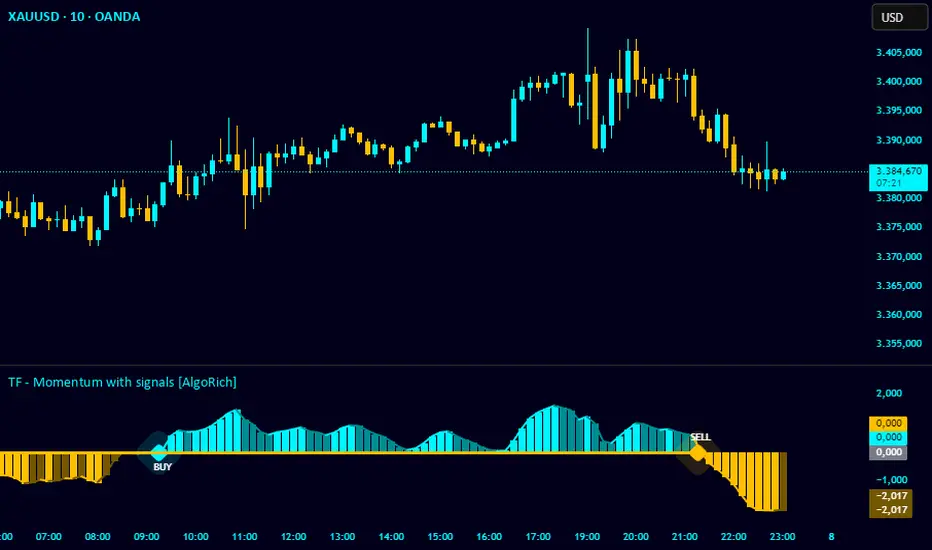 A SELL signal is triggered when the momentum crosses below the zero line, suggesting a potential move into bearish territory.