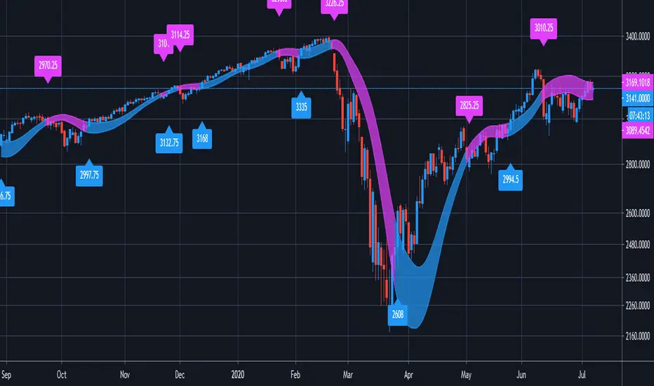 This will help to identify trends within markets on any time frame. It's based on moving averages thus you can select the moving average which you want to use and obviously it's length as well. The gummy worm will get a little fatter during times of higher volatility which helps avoid false signals.