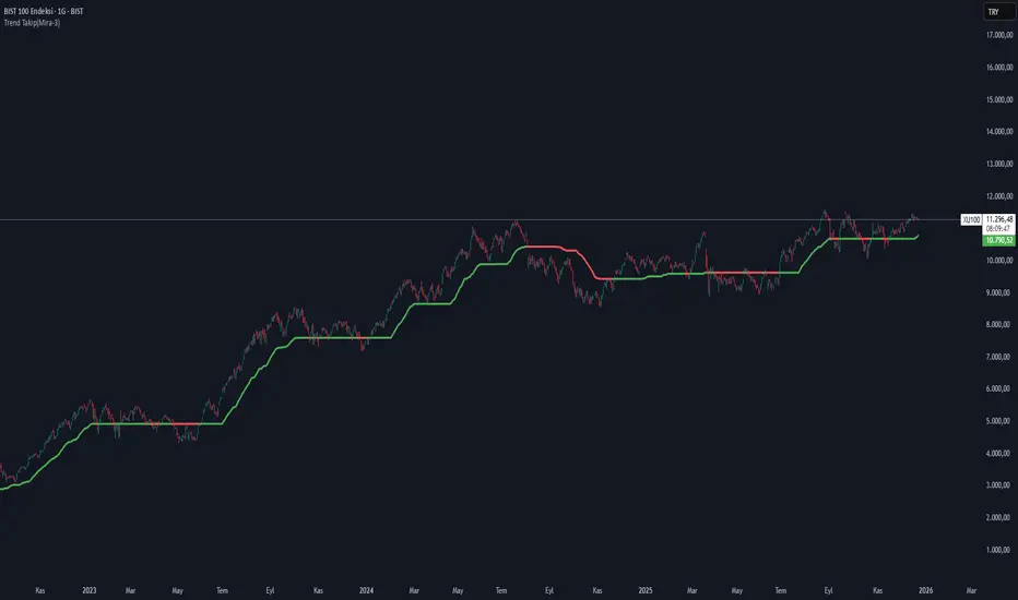 This indicator is a trend following system that uses moving averages and ATR (Average True Range), with adjustable settings included.